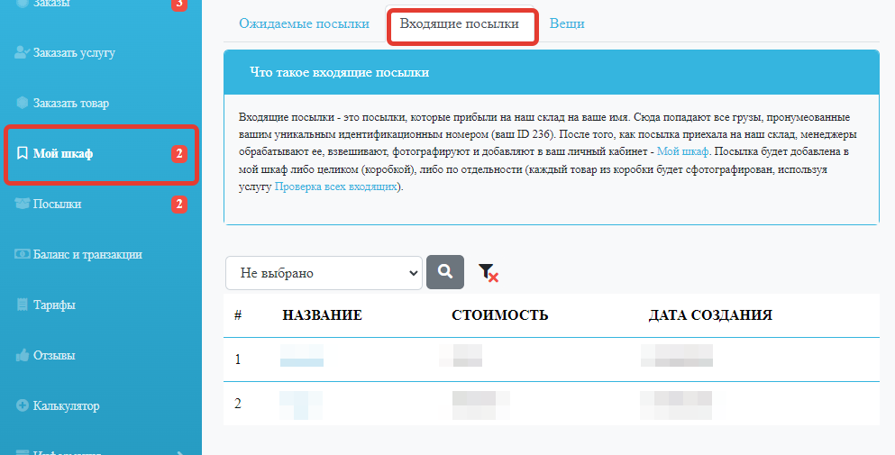 В разделе “Входящие посылки” отображаются все посылки, отправленные на ваше имя и полученные на складе Посылатора в Москве.