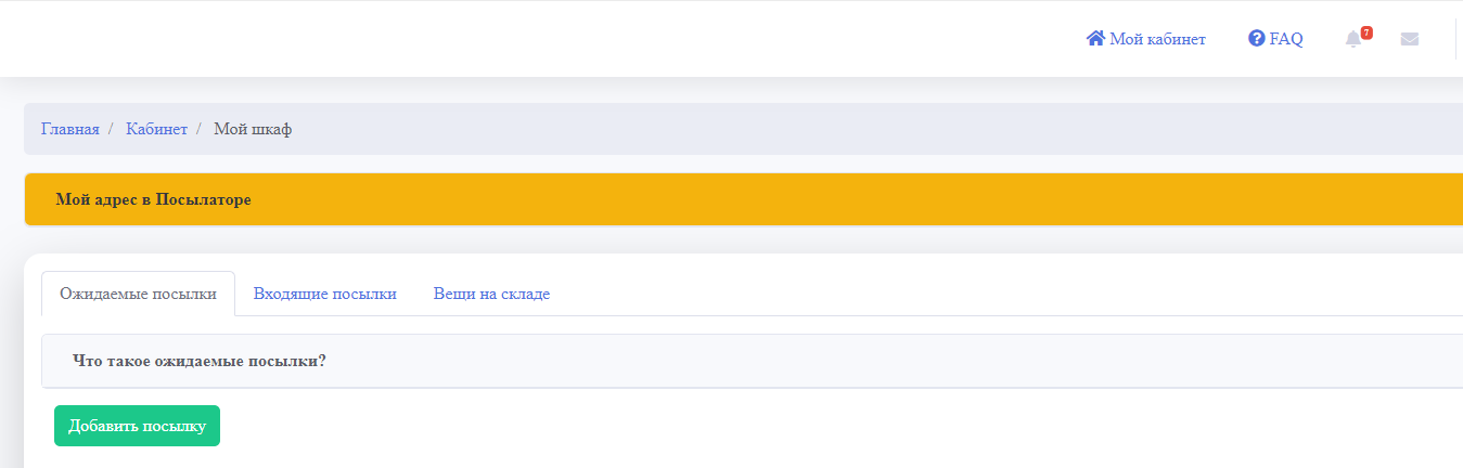 Входящие посылки Ожидаемые посылки Как Посылатор принимает посылки? Как узнать, что моя посылка приехала на склад Посылатора? Что происходит после того, как посылка приехала на склад Посылатора? Вы можете сфотографировать вещи в посылке? Как отправить посылку со склада Посылатора?