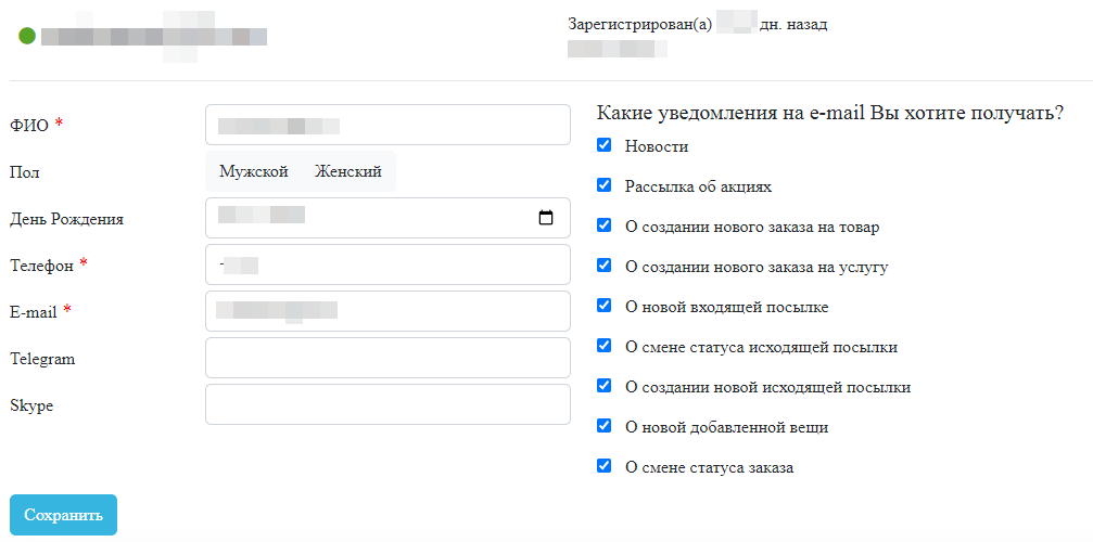 Перед вами поля, в которых мы предлагаем заполнить ваши персональные данные*. Эта информация поможет нам вовремя связаться с вами в случае возникновения затруднений.* - мы не передаем персональные данные третьим лицам, за исключением оказания услуг в целях доставки ваших посылок (например, адрес для Почты России). Пользуясь сервисом Посылатор, вы автоматически соглашаетесь с обработкой своих данных в соответствии с Федеральным Законом №152 "О персональных данных". Дополнительную информацию можно найти в разделе "Договор" и "Пользовательское соглашение" в вашем Личном кабинете. Обязательные для заполнения поля: