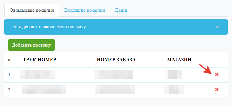 Чтобы удалить посылку из вашего списка ожидаемых посылок, нажмите на крестик. Посылка удалится из вашего списка “Ожидаемых посылок”; данные об этой посылке также полностью удалятся из системы Посылатор.